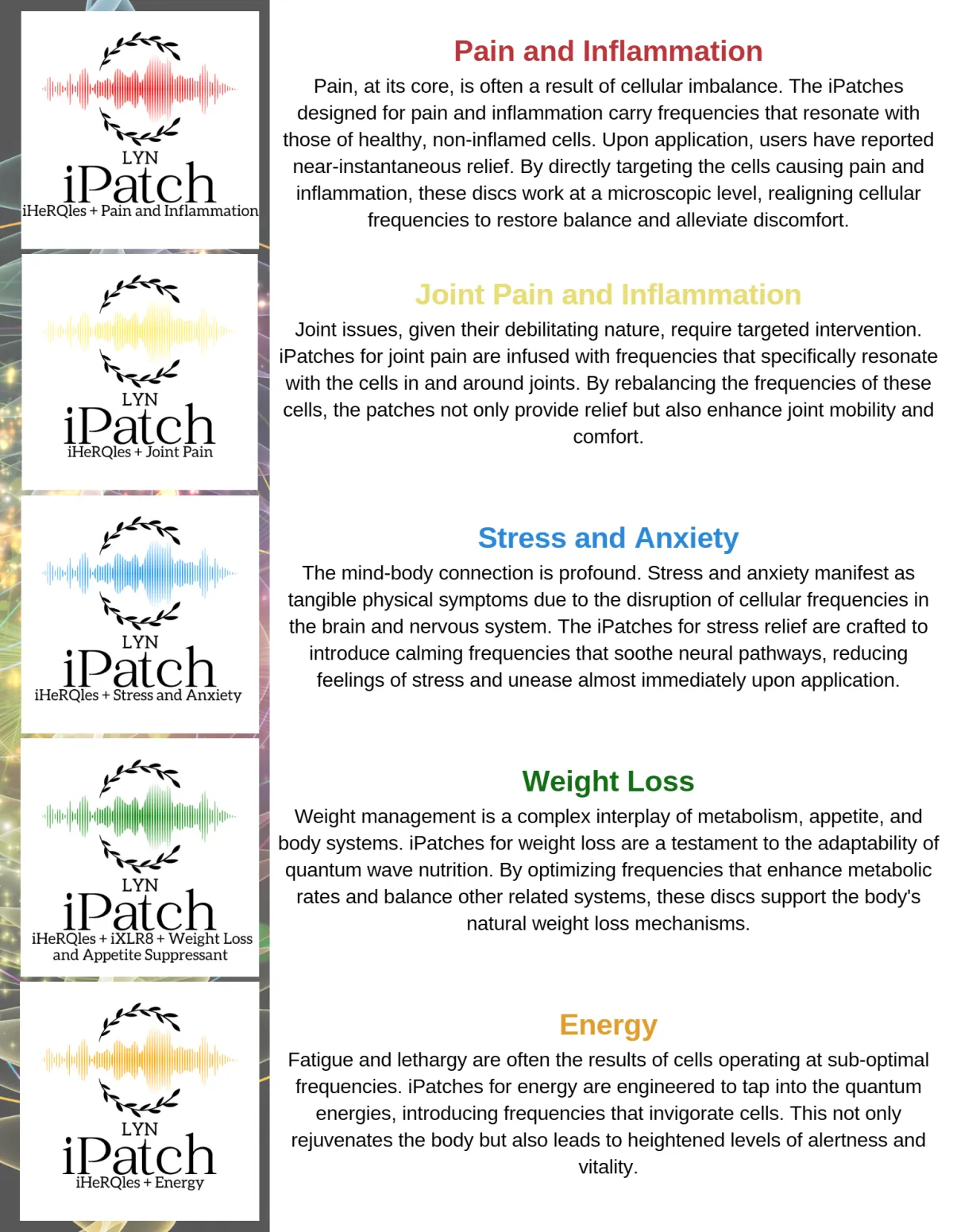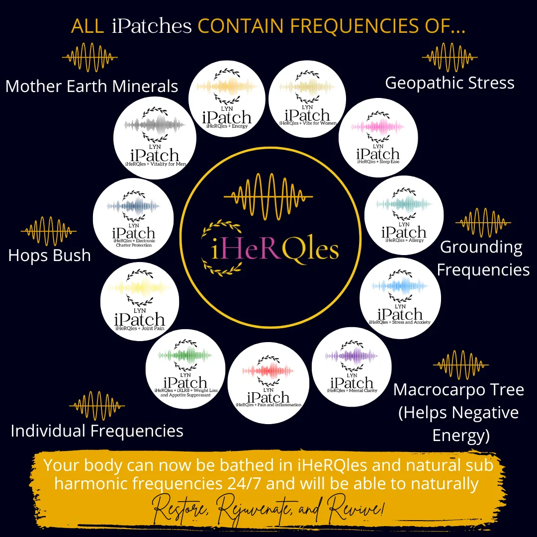 With our 16 Exclusive LYN iHeRQles Frequency iPatches, you will find one or more that meets your needs. Each iPatch below also has our exclusive reverse aging iHeRQles frequency in each one.