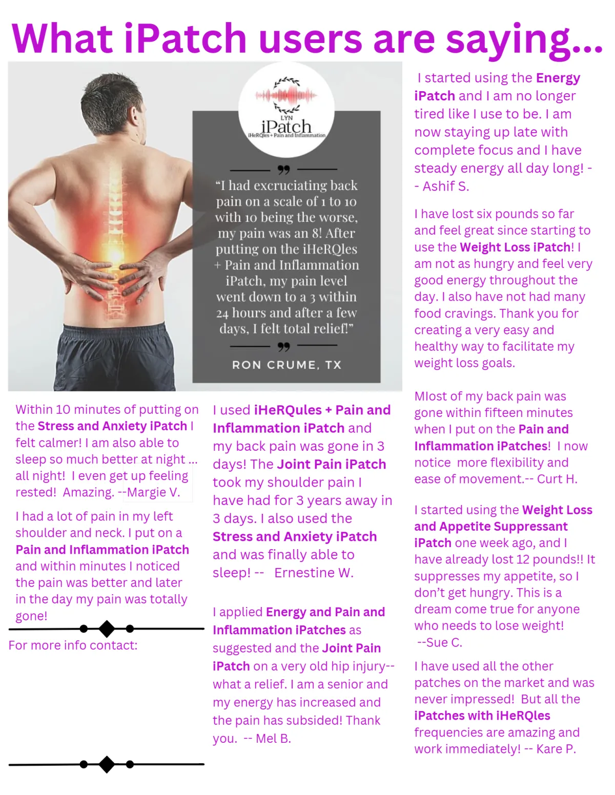"Testimonial for iPatch I want to lose some excess weight, so I started using the weight loss and appetite suppressant iPatch. | noticed that I was not as hungry and also felt a very good energy throughout the day. I have not had many of the food cravings that I get from time to time, so that is very nice too.I have lost five or six pounds so far and feel great. I thank you for creating a very easy and healthy way to facilitate my weight loss goals. I struggle with a lot of pain and inflammation due to many surgeries in the past. So ,l when I got the iPatches for pain and inflammation, I wanted to try them right away. I placed one on the left side of my back about half way up my back. It was within minutes when I started feeling some relief. I would say most of my back pain was gone within about fifteen minutes or so. I also noticed more flexibility and ease of movement. I am going to try these in other areas, as when the pain and inflammation is relieved, the body can heal itself much faster. I am always going to keep these close by. "